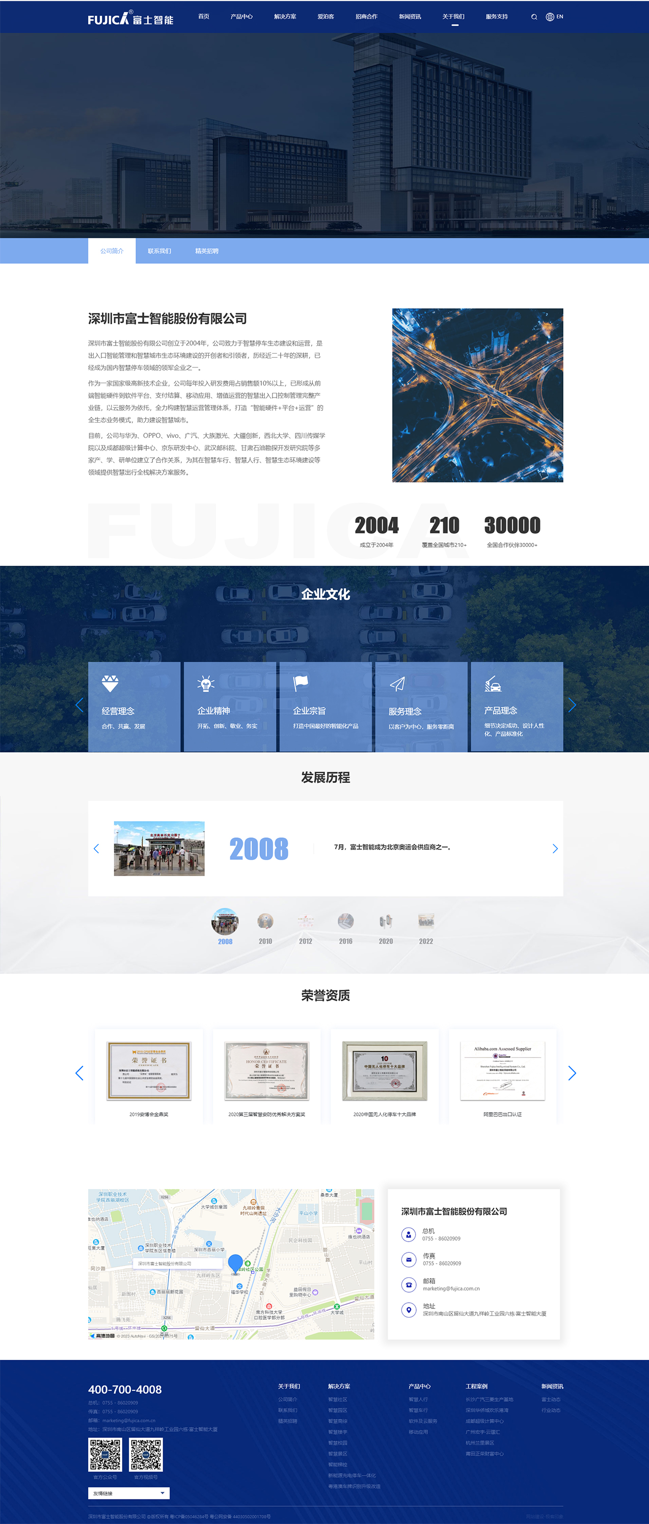 深圳市富士智能股份有限公司创立于2004年,公司致力于智慧停车生态建设和运营,是出入口智能管理和智慧城市生态环境建设的开创者和引领者,历经近二十年的深耕,已经成为国内智慧停车领域的领军企业之一。
